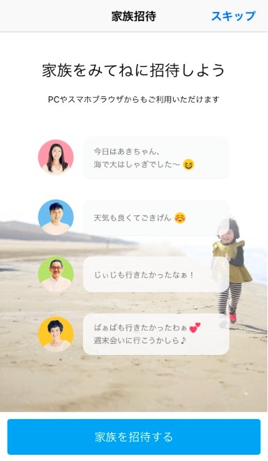 アプリにアップロードしたい写真や動画を選択したら、家族みんなで共有するのか、夫婦のみで共有するのかを選びましょう。招待する家族は、「家族設定」からいつでも追加することができ、動画にコメントを添えて公開したり、閲覧した写真に感想をコメントすることで、コミュニケーションを取ることも可能です。