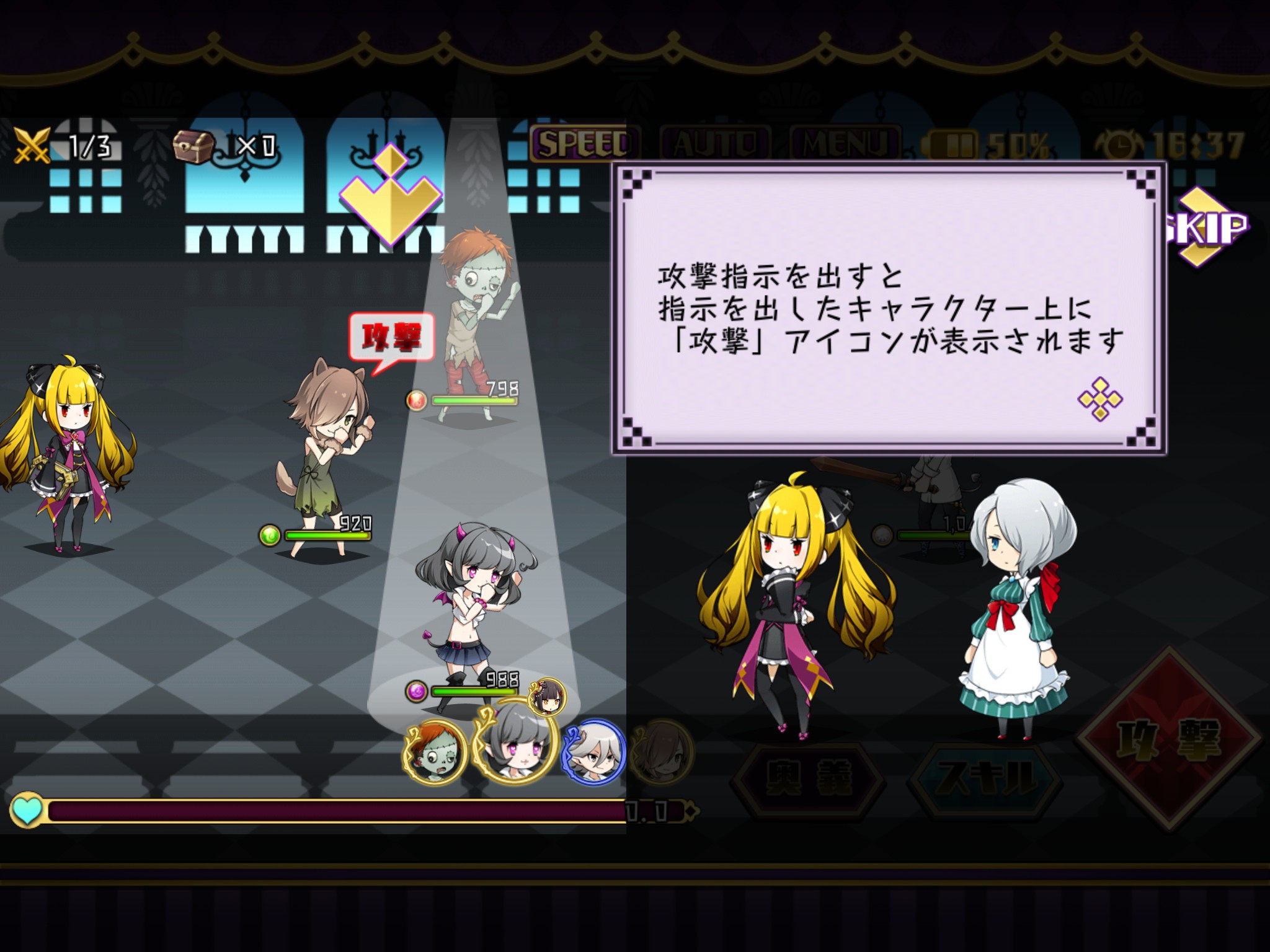 戦闘では味方のキャラクターに画面右下の攻撃のボタンをタップすることで攻撃指示をだすことができます。押したらすぐに攻撃するわけではなく、味方キャラ全てに指示を出した後に攻撃がスタートします。