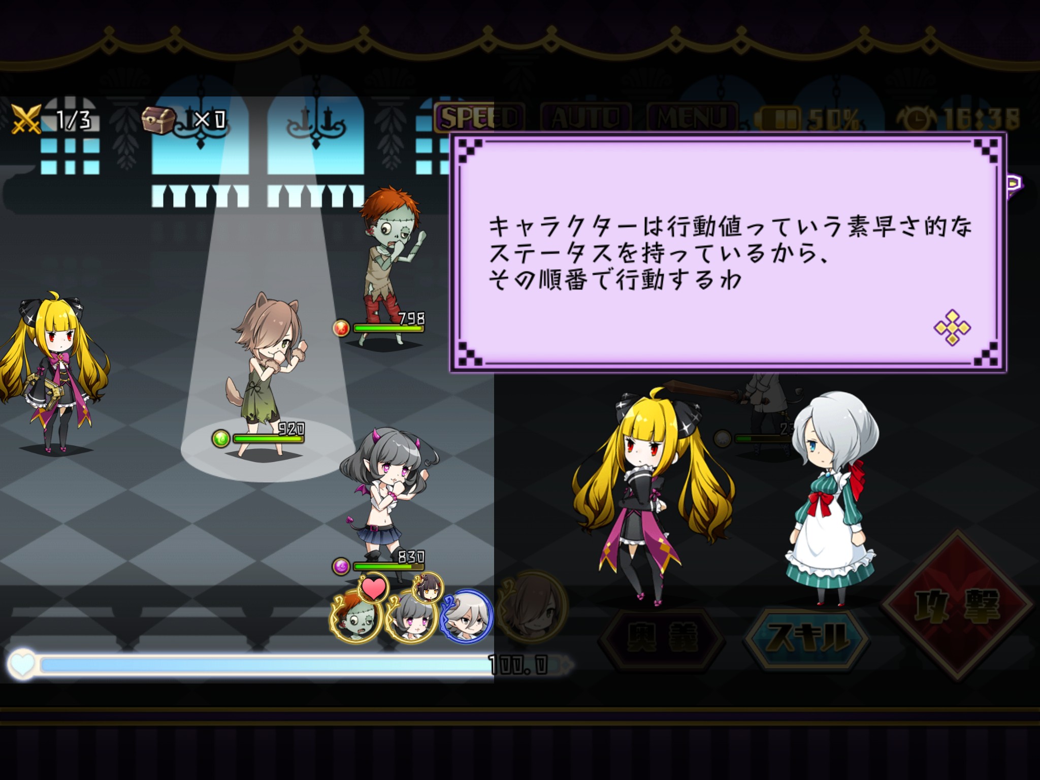 攻撃は画面下にある行動順に従って行われます。より右にいるキャラほど先に攻撃できて、敵味方全てのキャラが一通り攻撃したら1ターン終了、また攻撃指示を出す流れになっています。
