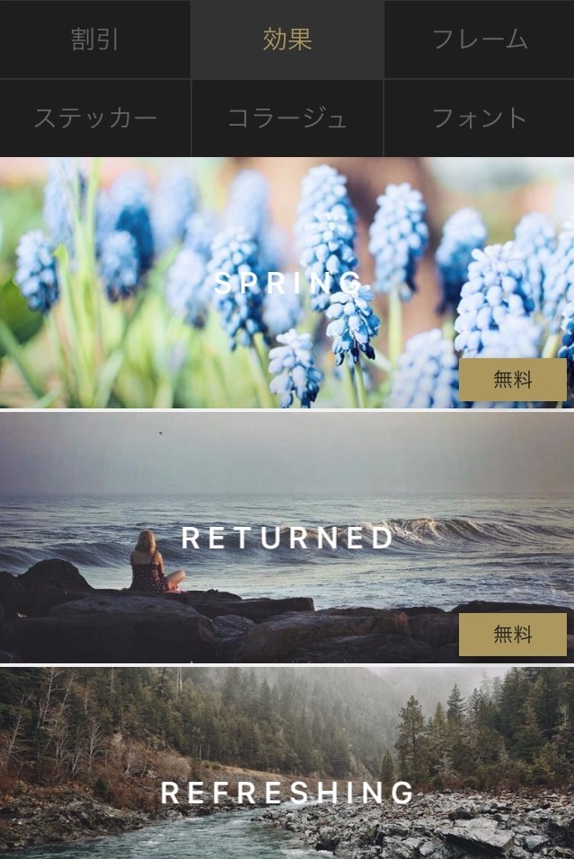 加工・編集、コラージュ作成の際に利用する素材ですが、アプリ内のストアから無料・有料でダウンロードすることができます。