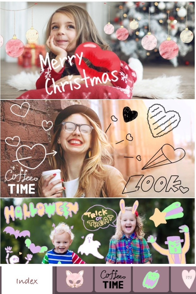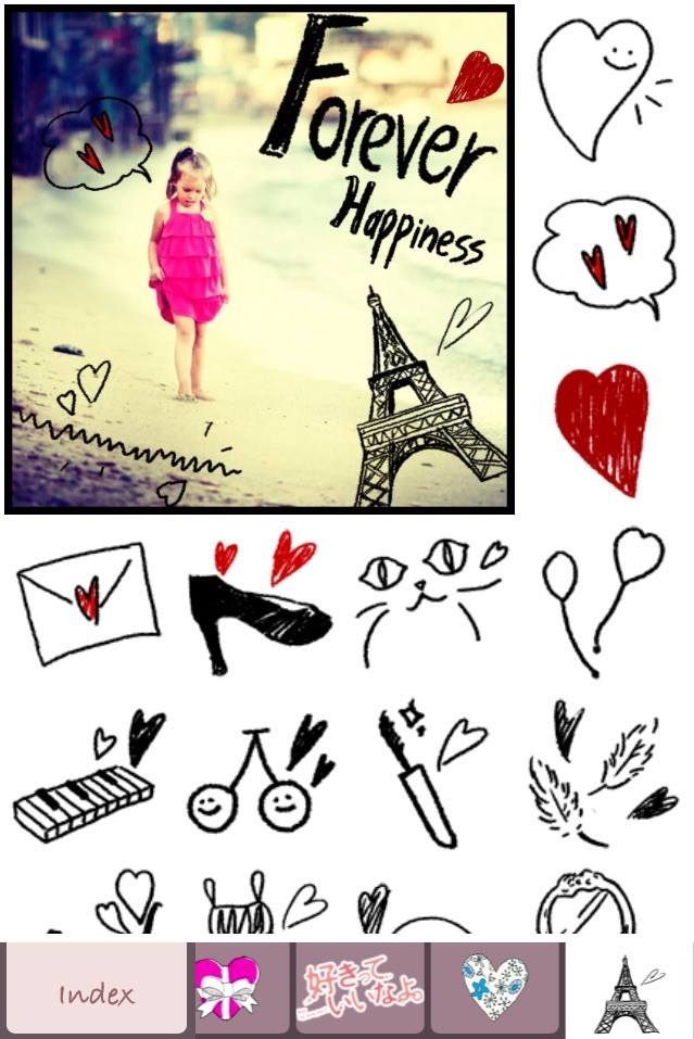 ハートや星、ネコ等をはじめ様々なタッチで作成されたイラストを写真を彩るアイテムとして使うことができます。