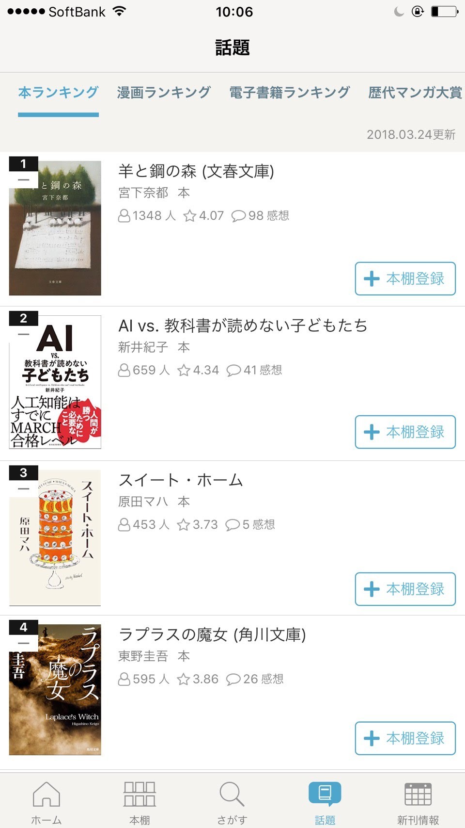 「新刊棚」のタブでは、著者名やジャンルなどを登録しておくと新刊情報を教えてくれるので、まさに一石二鳥のアプリと言えるでしょう。