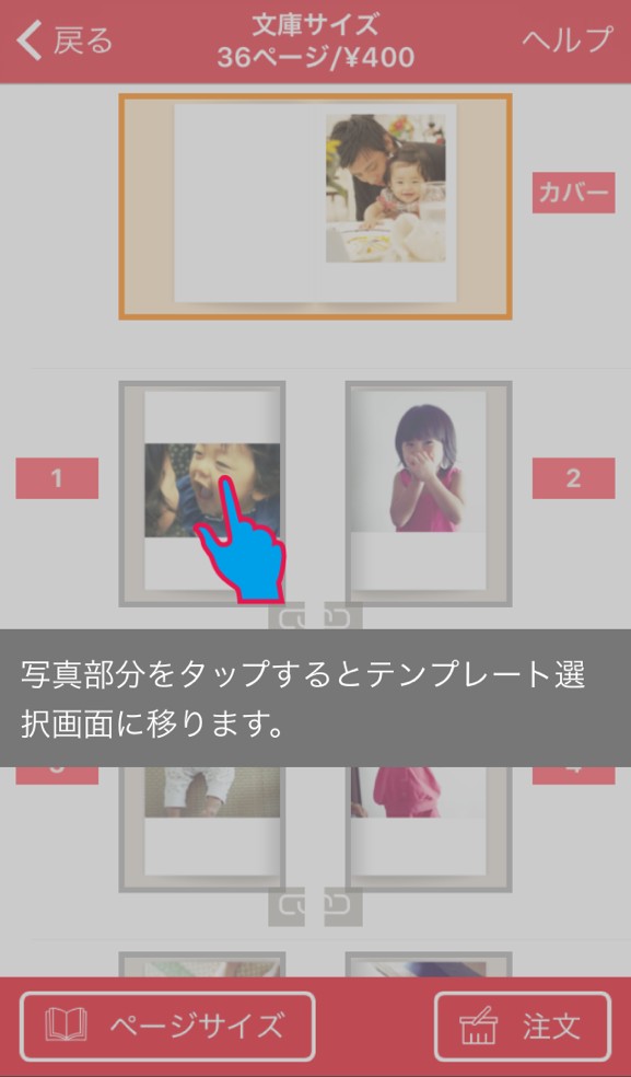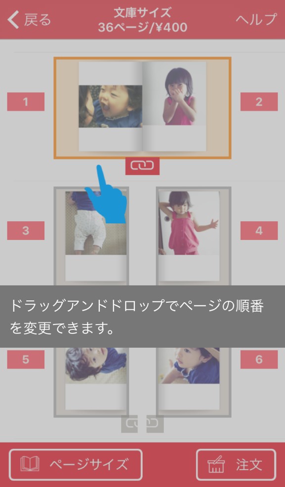 この画面から写真の配置やページレイアウトを変更できます。配置変更や移動は写真を長押ししてドラッグ移動で変更できます。
