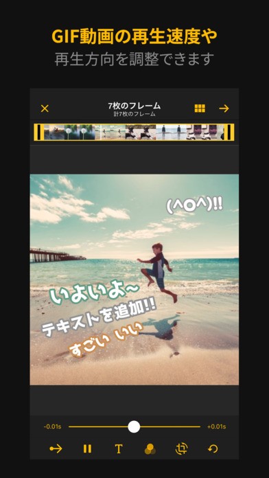 再生速度の幅が広い分だけ演出の幅が広がりますし、先ほどのテキストや加工を絡めながら沢山の面白い工夫を仕込むことが出来るのでとても楽しみながらGIFアニメ動画を作っていけますよ。