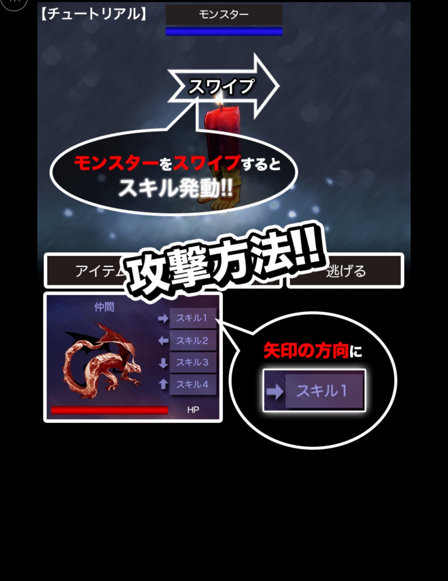 スキルでモンスターを攻撃していきます。スワイプの方向によってできる攻撃が異なります。右向きスワイプであればこれ、左向きスワイプであればこれ、という感じになります。スワイプは有効な範囲があるので、そこから外れてしまうとうまく攻撃できません。