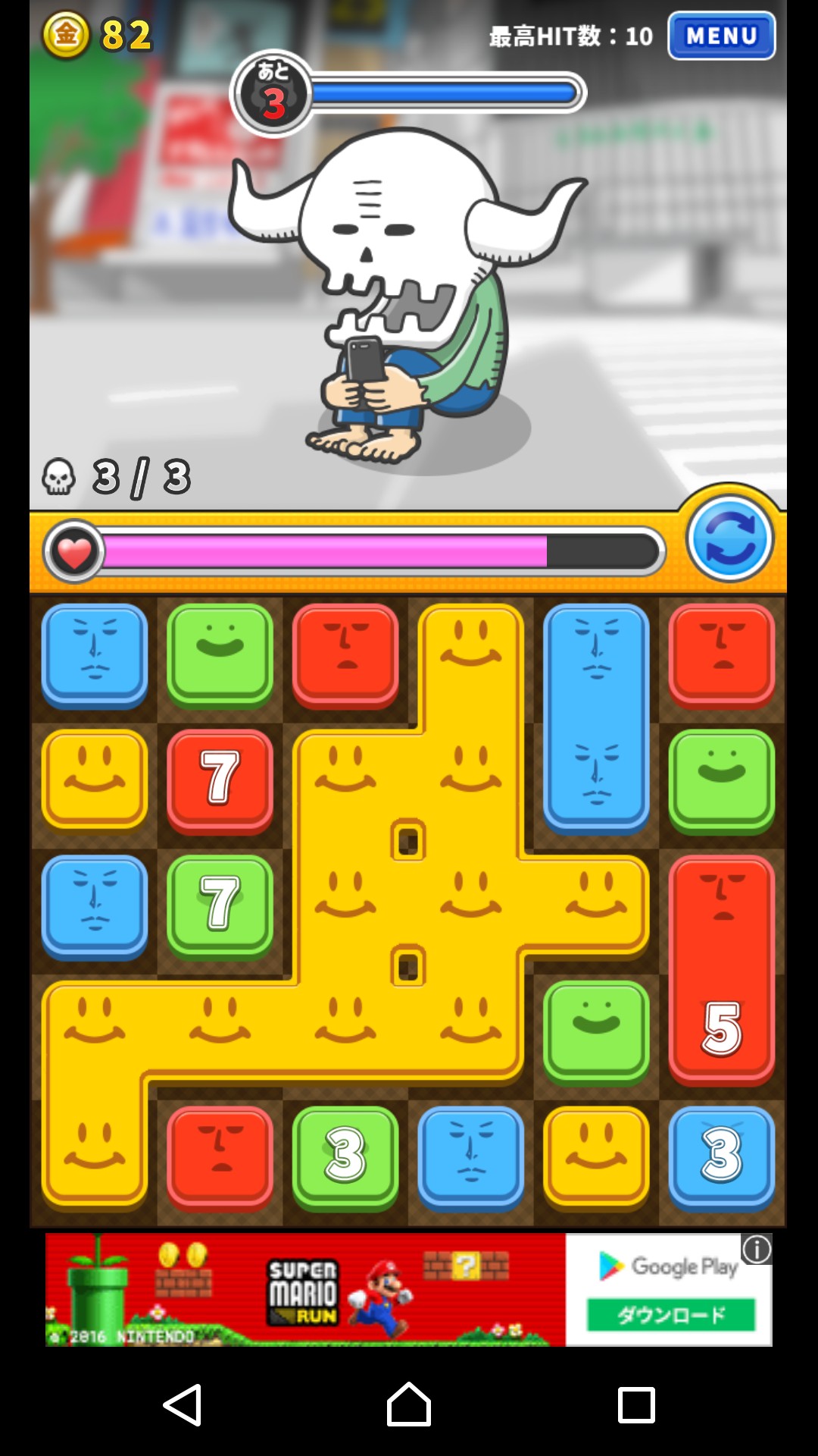 プレイヤーのライフの右側にあるグルッとしている矢印をタップすると、画面にあるタイルをシャッフルすることができますが、敵のターンが1つ減ってしまいます。