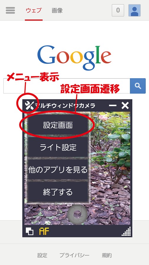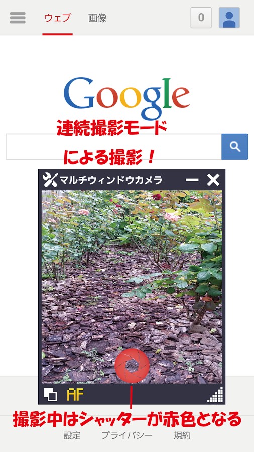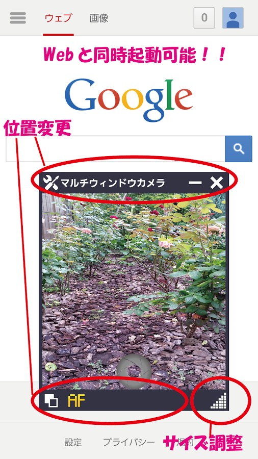 「マルチウィンドウカメラ」は、スマホで別の作業をしながら常にカメラを起動することができるアプリです。webで検索したり他のアプリで遊んだりしながらシャッターチャンスを待つことができるので、我慢強くない人でも簡単に決定的瞬間を速写できるでしょう。
