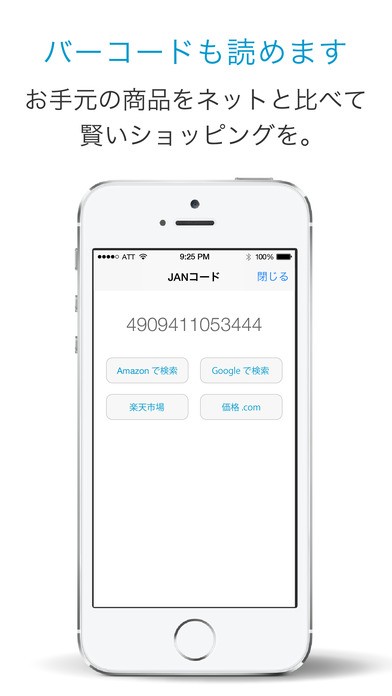 商品についているバーコードを読み取ります。それでどうなるの?って思いますよね。読み取ったバーコードはAmazon、Google、楽天市場、価格.COMで検索することが出来るように表示されます。ネットで価格を比較できるので、買い物上手になりそうですね。
