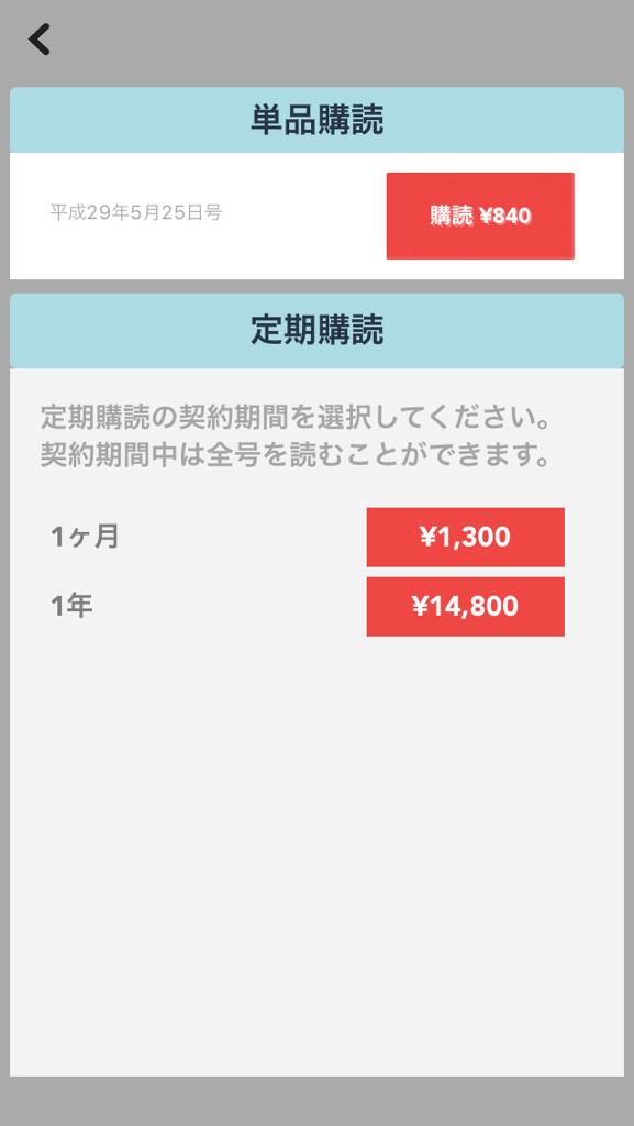 紙面で定期購読をする場合は1年での契約が基本となるのですが、このアプリ内では「単品購読」と「1ヶ月定期購読」があります。読みたい分、読みたい期間を自分なりに設定できるので便利です。定期購読の場合はその期間全号読むことが出来ます。