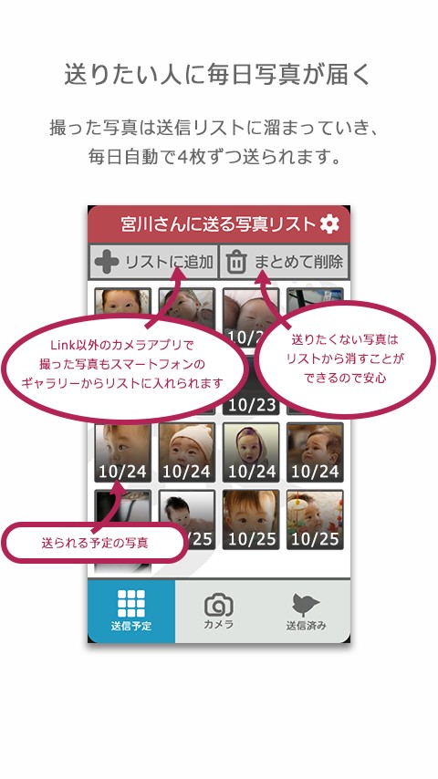 アプリ「Link」の設定方法や使い方は、慌ただしい毎日を過ごすお母さんでも簡単に利用できるように整えられています。撮影した子供の写真は自動でリストにまとめられて、毎日4枚ずつ相手に送信されます。リストには送信予定の日付がつくので、どの写真がいつ送られるのかがすぐにわかるでしょう。