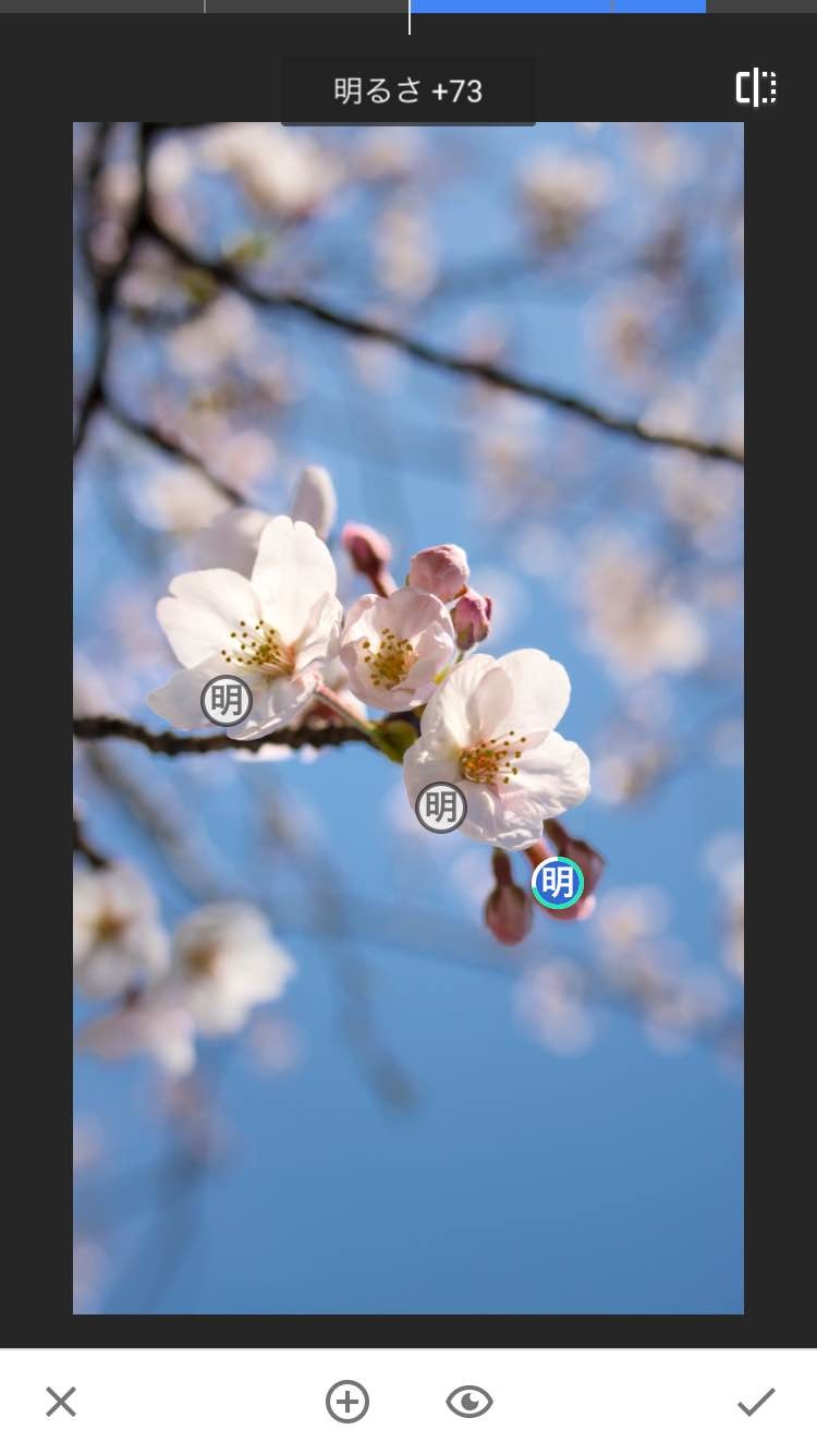 下のプラスボタンを押した後に、写真の調整したい部分をタップするとアイコンが置かれます。