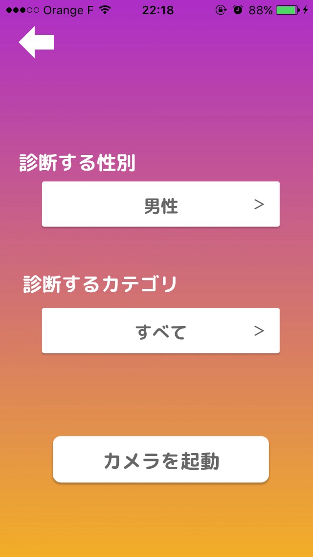 ②診断したい性別とカテゴリーを選択し、『カメラを起動』をタップします。