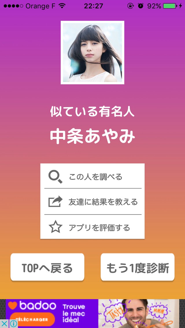 撮影した写真の角度によって診断が変わったり、実際は全く似てない結果も出てくるので、ショックな結果が出てきても気にしないようにしましょう。