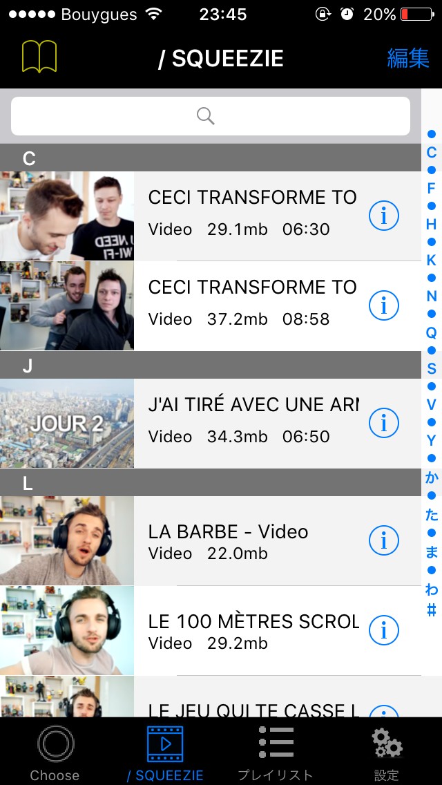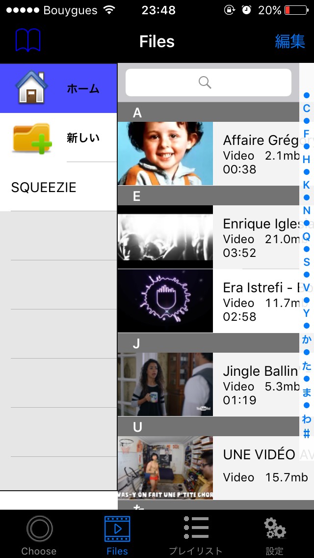 フォルダの管理:画面左上の本のアイコンをタップして、フォルダを作成します。同じ画面のまま動画を選択して、作成したフォルダに移動させることができます。