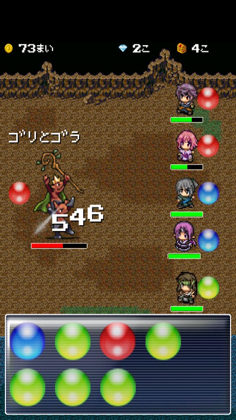 バトルはちょっとしたパズル的な要素を含んでいて、基本はコマンド選択式です。しかし各キャラには赤や青など色付きの玉が表示されています。的にも同様に玉が表示されていて、画面下にもズラリ。