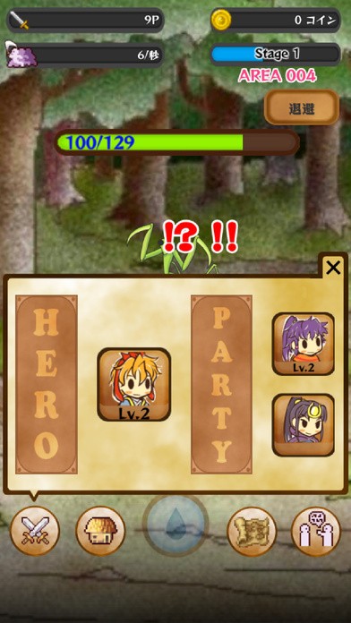 戦闘は純粋にひたすらタップするのみ、ただこの手のゲームには珍しくHPの概念があるため、もたもたしてるとやられてしまいます。勇者1人では心もとないので画面左下のアイコンから仲間を雇い強化しましょう。