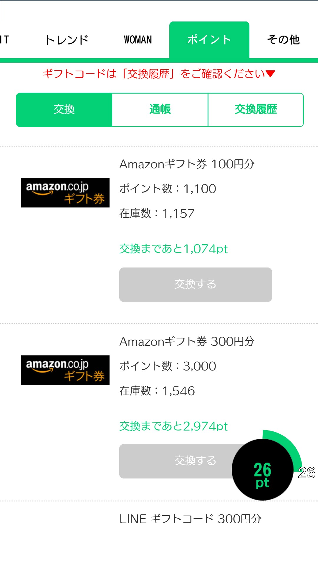 獲得ポイントはいつでも確認できて、各ギフトコードなどと交換できるまで「あと○○ポイント」と表示されるので、とても分かりやすくなっています。