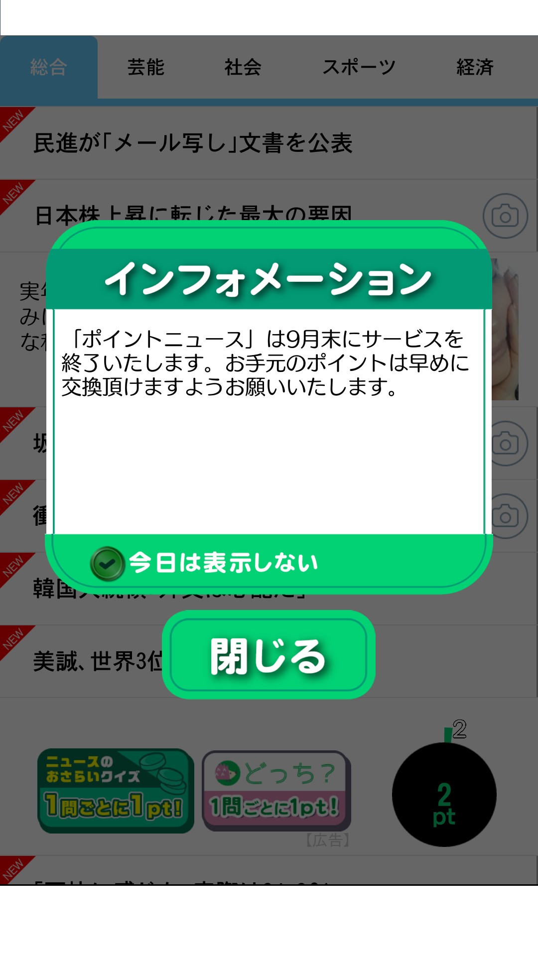 ポイントニュースは、2017年9月末をもってサービスが終了となります。そして、サービス終了約3ヶ月前の2017年6月頃に、新サイト「ポイニュー」をリリースする予定となっています。