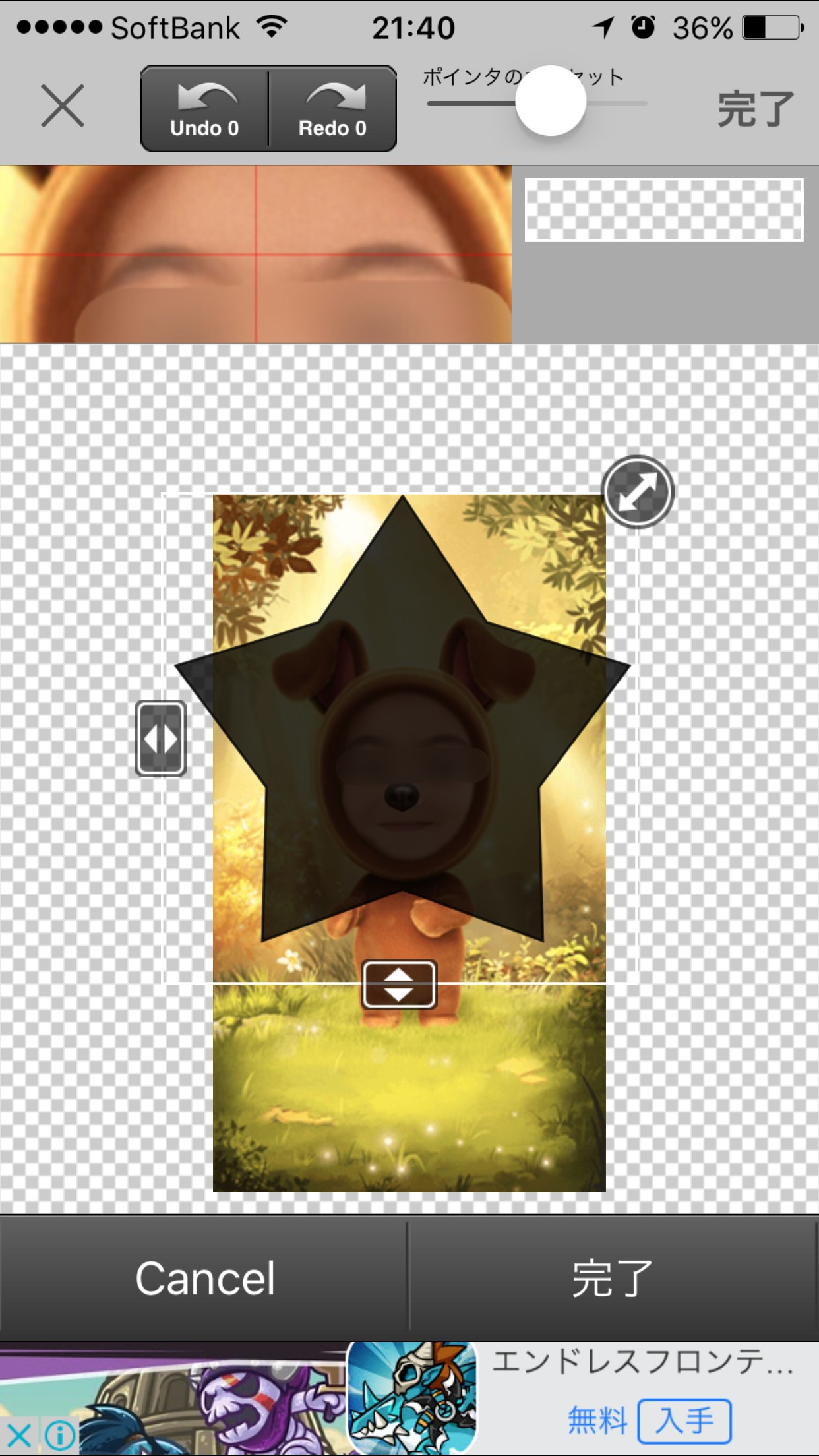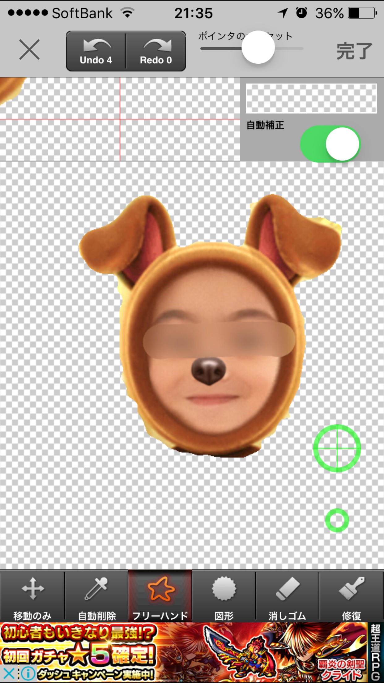 消しゴムボタンをタップすることで、スライドで指定した位置の背景を削除します。