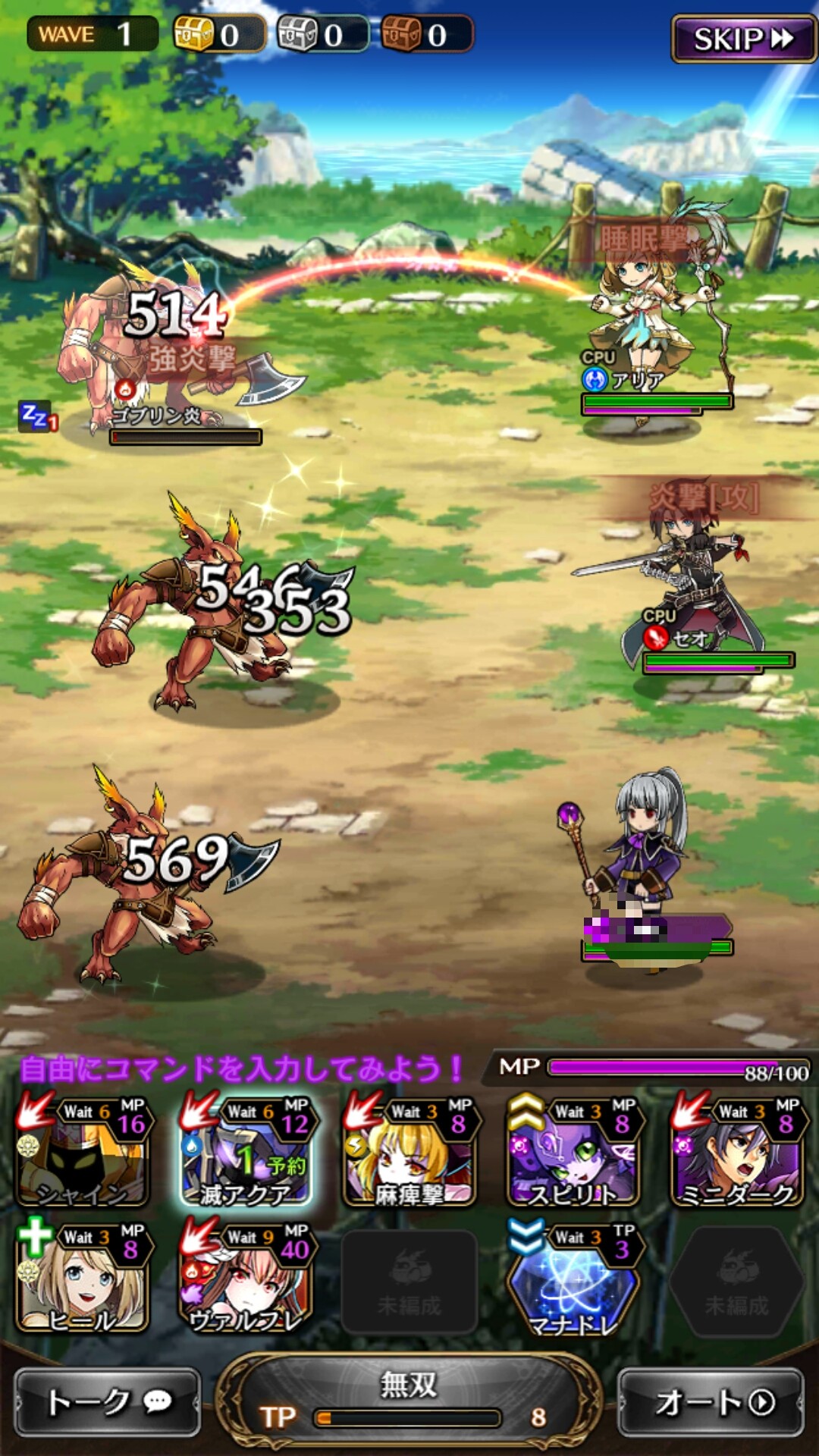 スキルウェイトがゼロになったら、スキルを発動することができる様になるので、スキルを使って攻撃していきましょう。