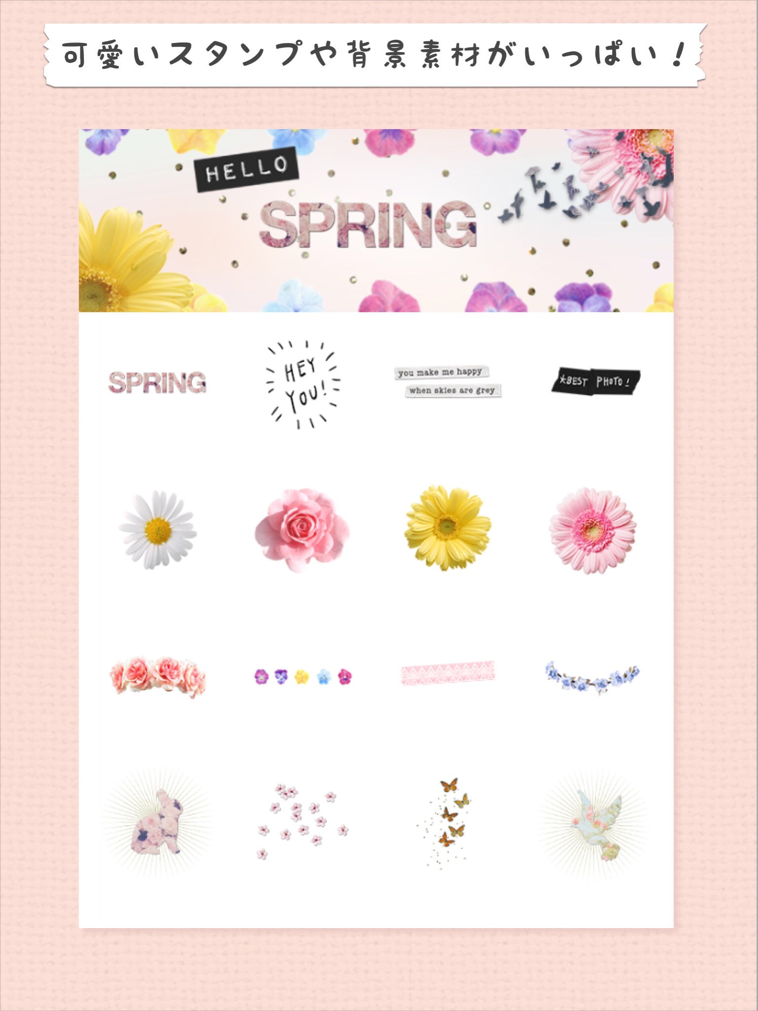 無料のスタンプも多数あり簡単にかわいくできるコラージュ素材。サンリオなど有名キャラクターのスタンプもあるのでお気に入りを探してみましょう。