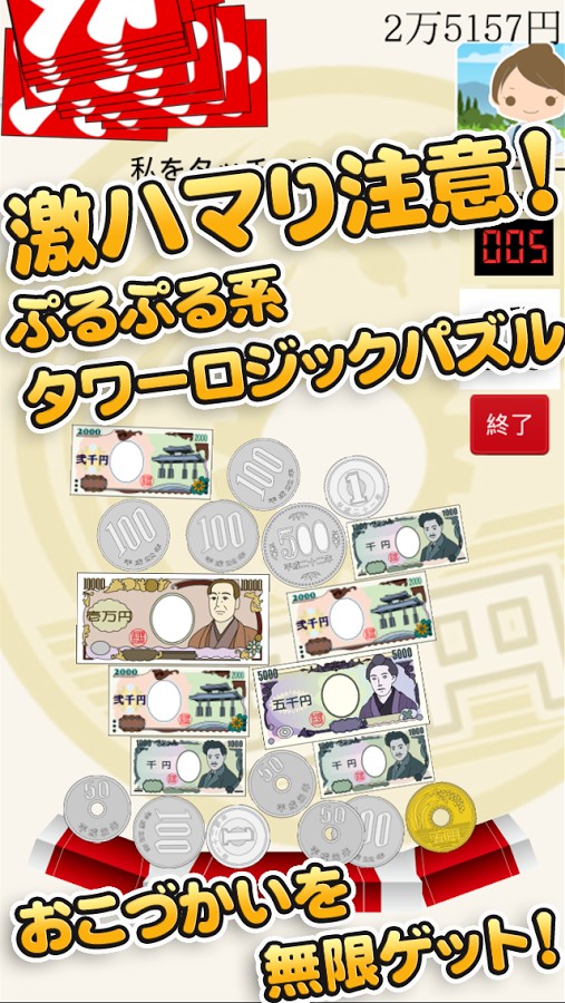 ぷるぷる系タワーロジックパズルって何?ゲームが詳しくないからわからない!名前だけ聞いたら、全然簡単そうに思わない!という方に向けて、詳しく、ゲームの内容を説明していきたいと思います!遊び方としては、大袋に入っているお小遣いを引っ張って、銀行のカウンターに積むだけで、即自分の口座に入金させる!自分の受付番号がきたら、お姉さんのアイコンをタップする。という内容になっています。単純な作業で、しかも楽しいのが、このアプリの魅力になっています。単純なゲームが大好きという方は、是非、利用してみてください。プラスお小遣いも貰えちゃいますので、欲しかったものを購入する足しにしてみてはいかがでしょうか?
