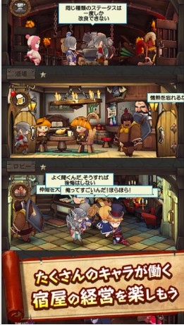 仲間になったヒーローたちは、皆宿屋に入ります。クエストをクリアしてストーリーが進むたびに、宿屋を拡張していくことが可能で、宿泊部屋を充実させることによって、ヒーローたちの能力もアップしていきます。パーティがより強力になって、バトルを有利に進められるようになるでしょう。宿屋を増築し、ヒーローたちが増えていく様子は眺めているだけで楽しく、キャラクターたちの可愛いビジュアルも手伝って、ほのぼのとした癒しの空間が広がります。ぜひほのぼの経営とバトルの両方を、スマホで気軽に楽しんでみてくださいね。
