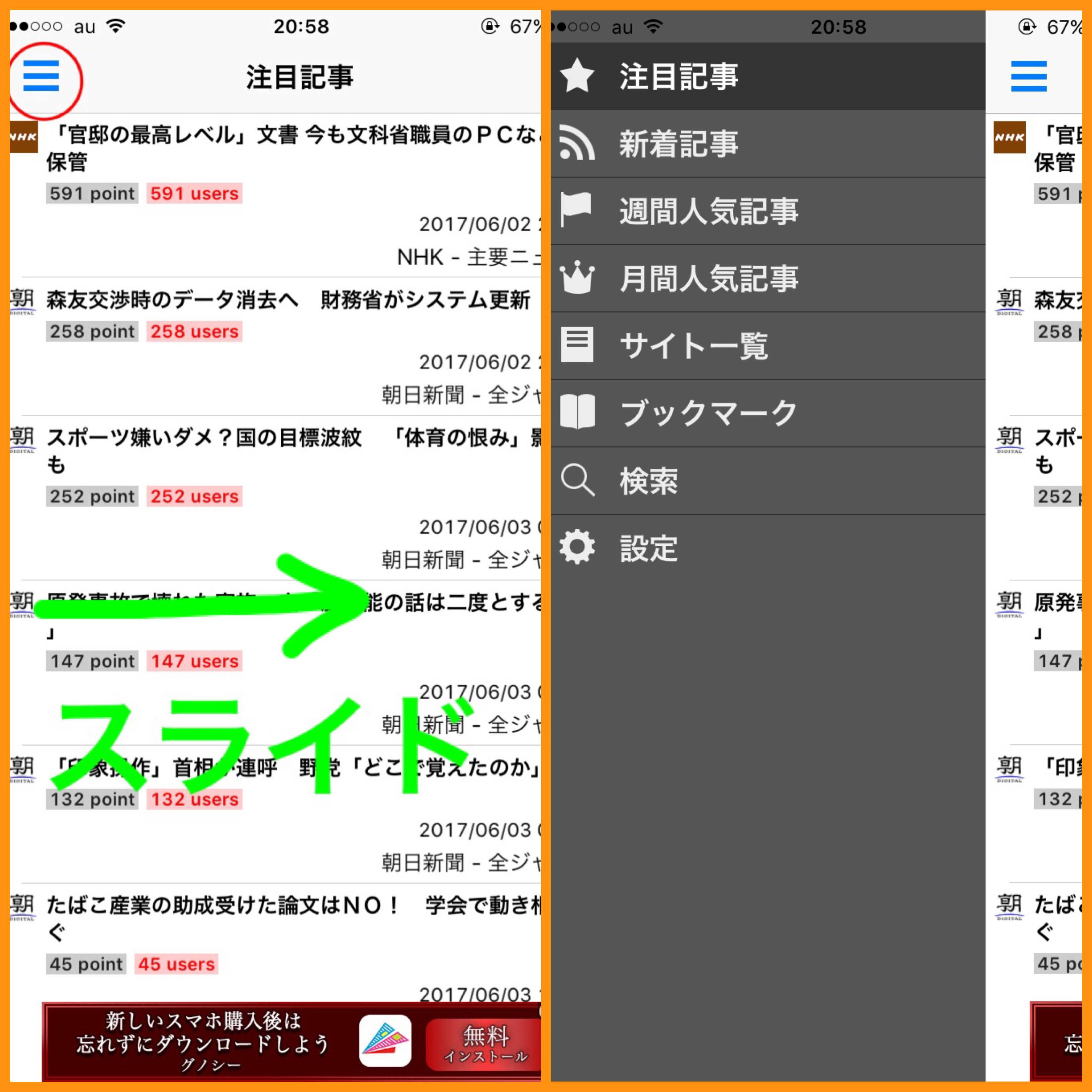 アプリが立ち上がったら、最初に「注目記事」が表示されます。これだけでもその日の注目ニュースが読めるのでチェックしやすいです。さらに画面左上の赤丸の所をタップするかもしくは画面を右へスライドさせると各項目が出てきます。ここから「新着記事」や「週刊人気記事」「月刊人気記事」をタップすれば、すぐに各サイトニュース一覧が表示されます。