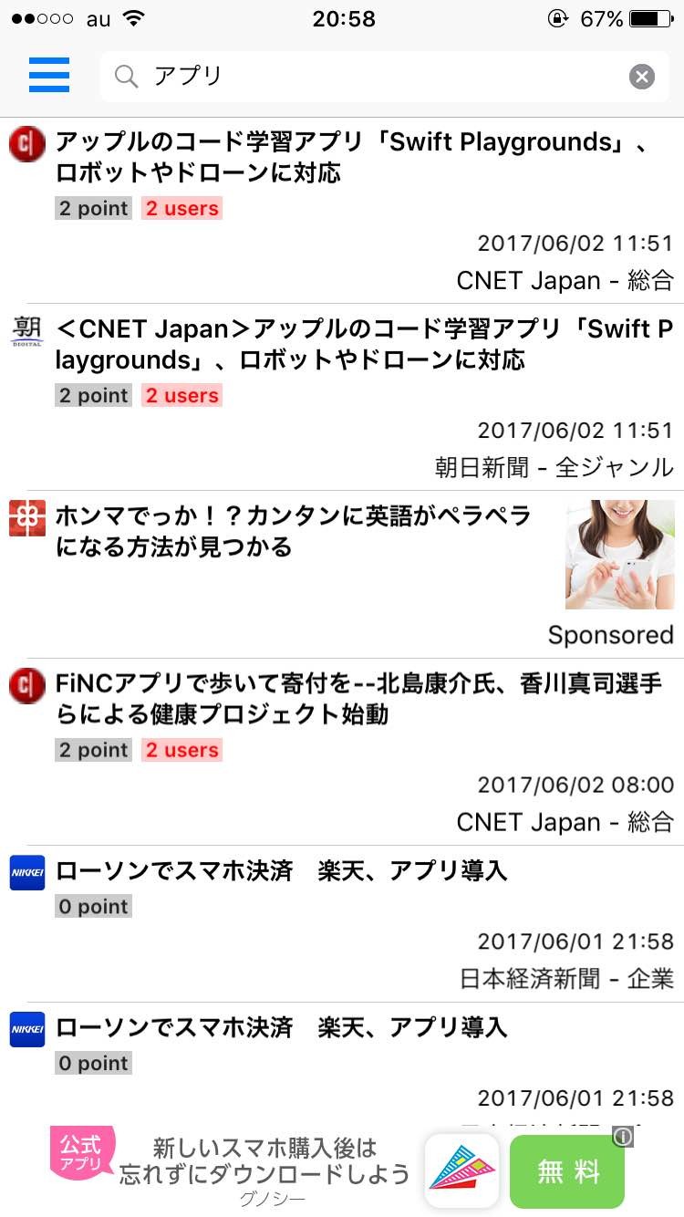 試しに「アプリ」と検索してみると、上にある画像のようにキーワード「アプリ」に関連した記事が日付の新しい順に表示されます。