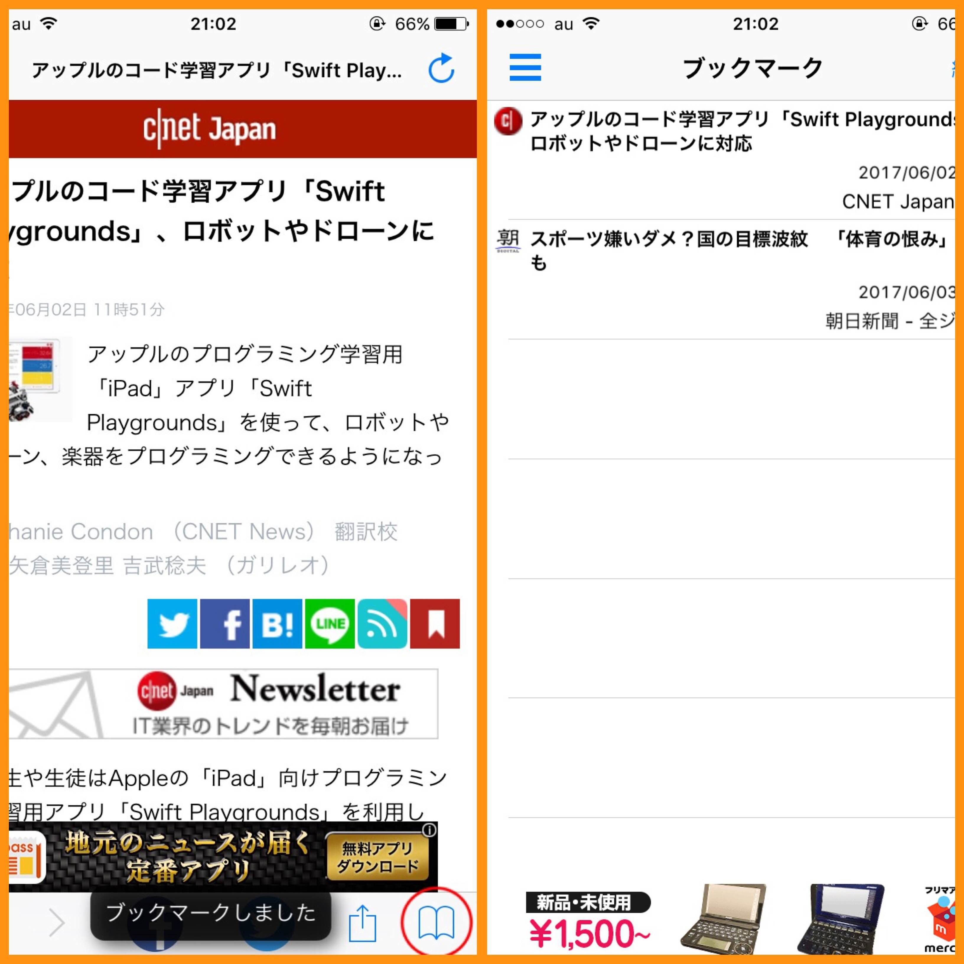 しかしこのアプリには「ブックマーク」の機能が用意されていて、「お気に入りの記事」をすぐに読み返す事が出来ます。方法は各記事の右下赤丸の場所にある「本のマーク」をタップするだけです。ブックマークした記事は、画面左上のボタンまたは画面を右にスライドしたら出てくる項目の中に「ブックマーク」とあるので、その中に保存されています。ブックマーク機能を使う為に会員登録などは必要ありません。