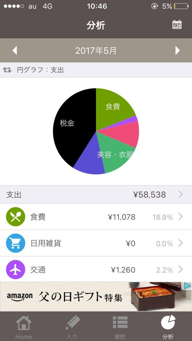 支出がカテゴリーごとに色分けされて出てくるので、お金を使いすぎてしまっている部分が一目で分かります。