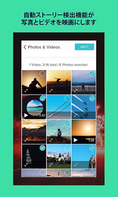 自分が撮影した動画や写真が、ライブラリーに溜め込まれているので、その中からムービーとして仕上げたい動画や写真を選択します。初めは遊び感覚で適当に選んでみても良いでしょう。