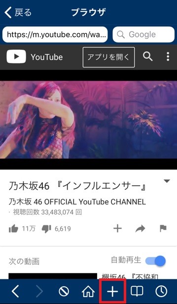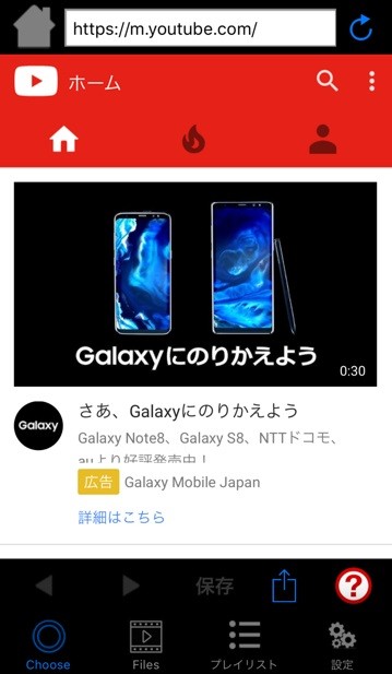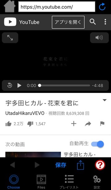 アプリ内のブラウザから動画を検索して保存する場合は、ホーム画面で「Webブラウザ」をタップして、保存したい動画を表示させます。動画を表示させると、上図のように「保存」の項目が自動的に表示されます。