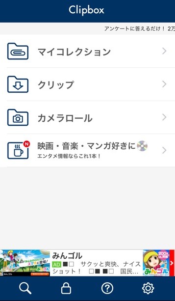 アプリを開くと上図のような画面が表示されます。動画を検索して保存するには、「クリップ」をタップします。「クリップ」をタップすると、「ブラウザ」と「URL」の2つの項目が表示されます。