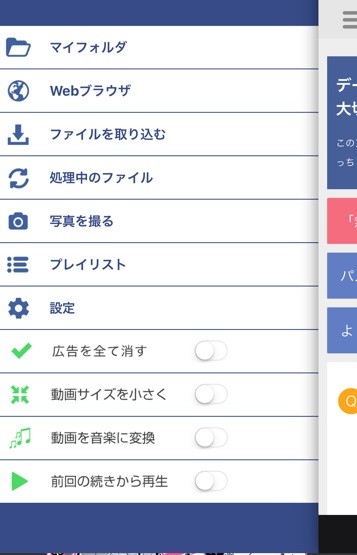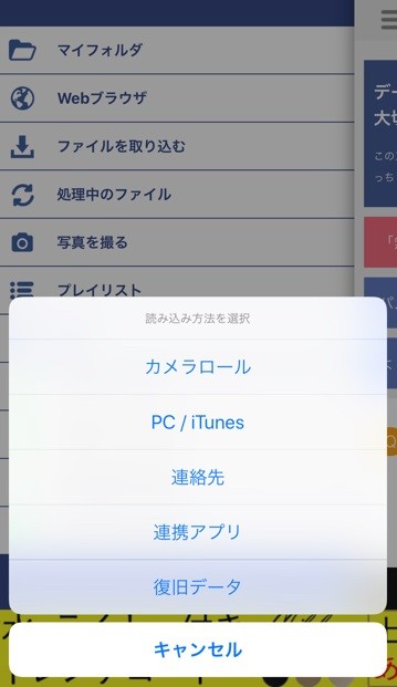 ブラウザから動画を探して保存することもできますが、外部から読み込んで保存することもできます。外部から動画を保存する場合は、「ファイルを読み込む」をタップすると上図のような画面が表示されますので、読み込み方法を選択します。読み込み方法は、「カメラロール」「PC・iTunes」「連携アプリ」などがあります。