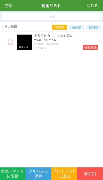 動画サイトから保存した動画は、上図のような「動画リスト」に保存されます。「動画リスト」では、音楽ファイルに変換して容量を小さくしたり、動画のままアルバムに保存することもできます。また、プレイリストに追加して動画を移動して、ジャンルや好きなカテゴリごとにまとめることもできます。