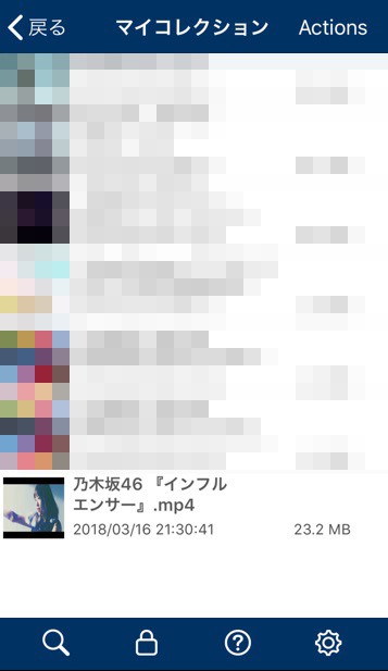 保存した動画は、動画を保存するときに選択したフォルダに保存されています。上図の画面では「マイコレクション」ですが、「マイコレクション」画面の上部に表示されている「Actions」をタップすると、フォルダの作成や移動、削除などができます。