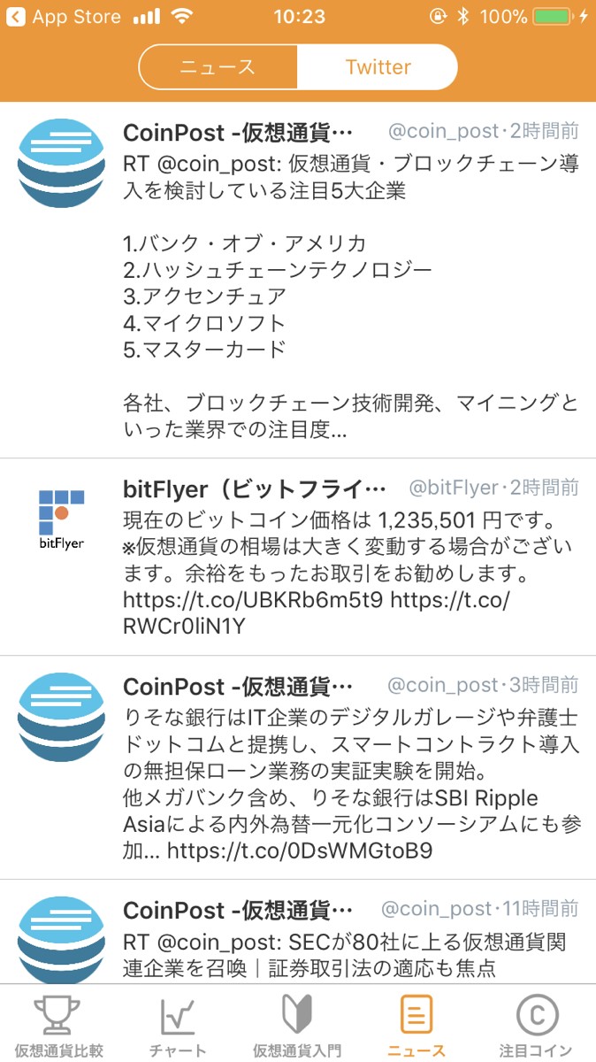 仮想通貨市場は日々細かく変動しており、さらに短期間のうちに突然市場が激しく動くこともあります。実際に仮想通貨ICOプロジェクトは2017年後半に爆発的に増えたとされており、早い情報のキャッチが仮想通貨運営のポイントとなるでしょう。この市場で起こるニュースやICOリリース情報などは常に手に入れておきたいものです。「はじめての仮想通貨」では、仮想通貨全般の知識などに加えて、市場のニュースを手に入れることもできます。ここで話題となった企業のICO情報を調べると、思わぬ良い情報が手に入ることもあるかもしれません。ニュースを見るには、同アプリを起動後に下部のメニューの中から、「ニュース」アイコンを選択します。随時更新されるニュースと共に、SNSの一つであるTwitterの情報も見ることができます。Twitterでは企業公式アプリなどがあり、最新の情報が素早く手に入るメリットがあります。同アプリのTwitterニュースに関しては、一般人の情報ではなく「企業公式」や「仮想通貨ニュースbot」による情報を主として拾って表示していますが、情報が多岐に渡るため情報の真偽を自分で確認することをおすすめします。