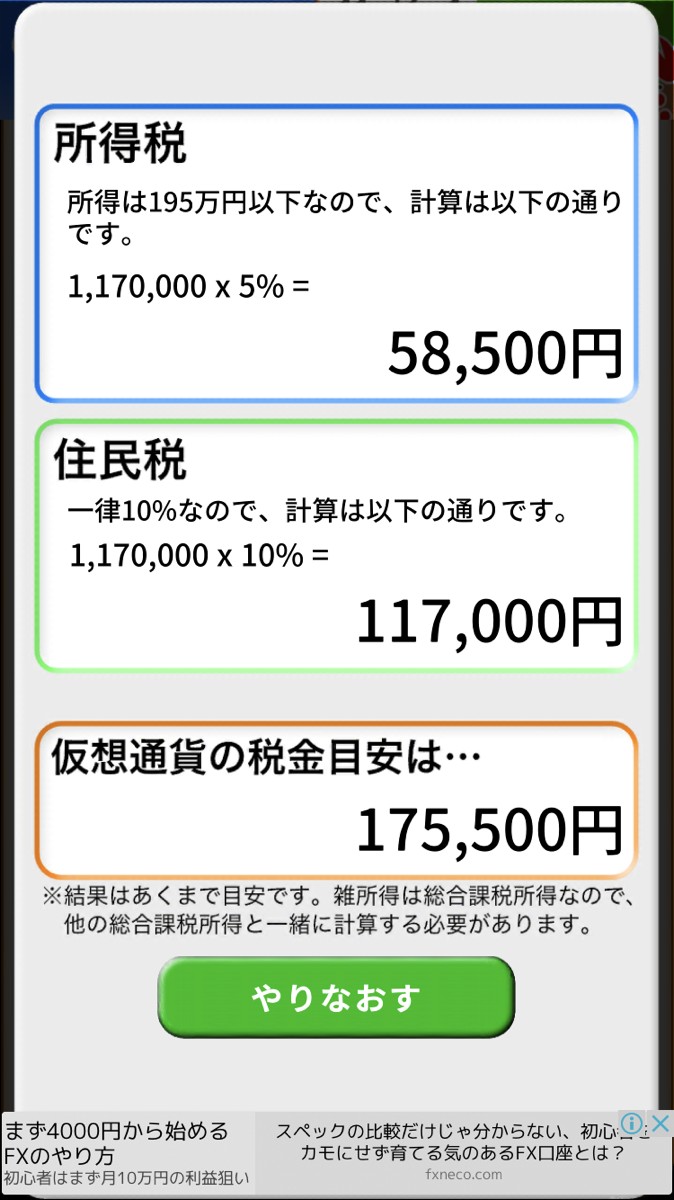 さて、117万円の数値をアプリに打ち込み、計算した結果がこちらです。117万円の利益に対して、税金はおよそ175,500円かかる計算になりました。この結果は目安であり、そもそも117万円の利益に対しても、およその数なので「大体この程度」という感覚で捉えるのがよさそうです。算出結果を見てわかるように、「仮想通貨の税金目安」では税金の内訳も分かるように表示されます。実際の雑所得を算出する場合は、雑所得は総合課税所得に分類されるので、さらにそのほかの総合課税所得と計算する必要があることを念頭に置いておいてください。この計算結果は保存することはできませんが、画面下部にある「やりなおす」ボタンをタップすることで、新しく金額の税計算をすることができます。確定申告が必要な程利益が出たときに税金を概算したり、確定申告時に大幅に計算を間違えていないかの目安に使用したりすると同アプリが活用できそうです。さらに、利益が大きくなりそうな大型トレードの際にはあらかじめどの程度税金で利益が差し引かれるのかの目安として使用するのも一つのアイデアです。
