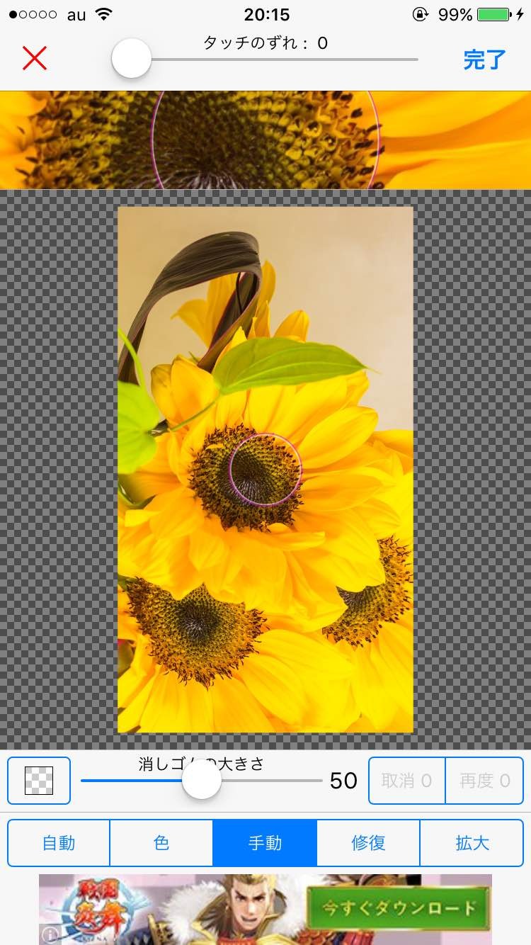 手動は先程の「自動」や「色」と違って、不要な部分を消しゴムの様に消す事が出来る機能です。
