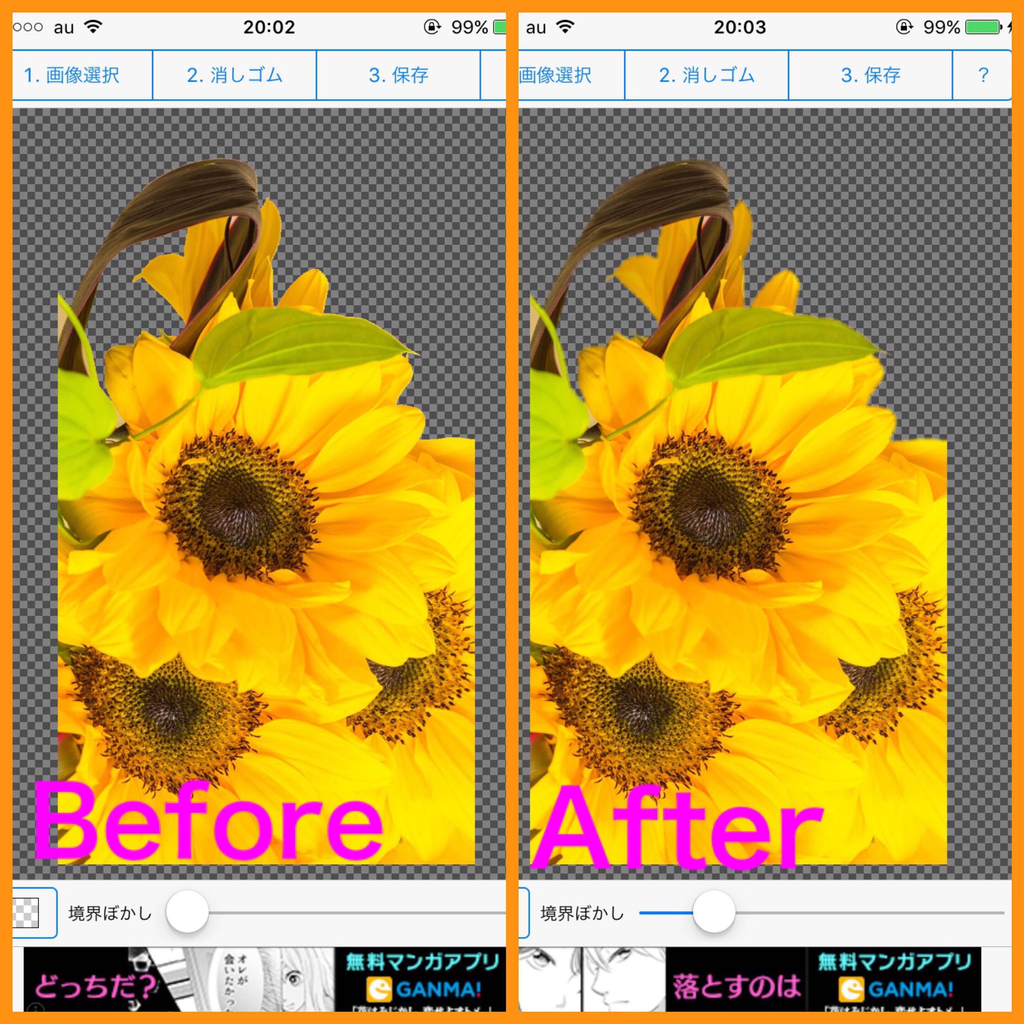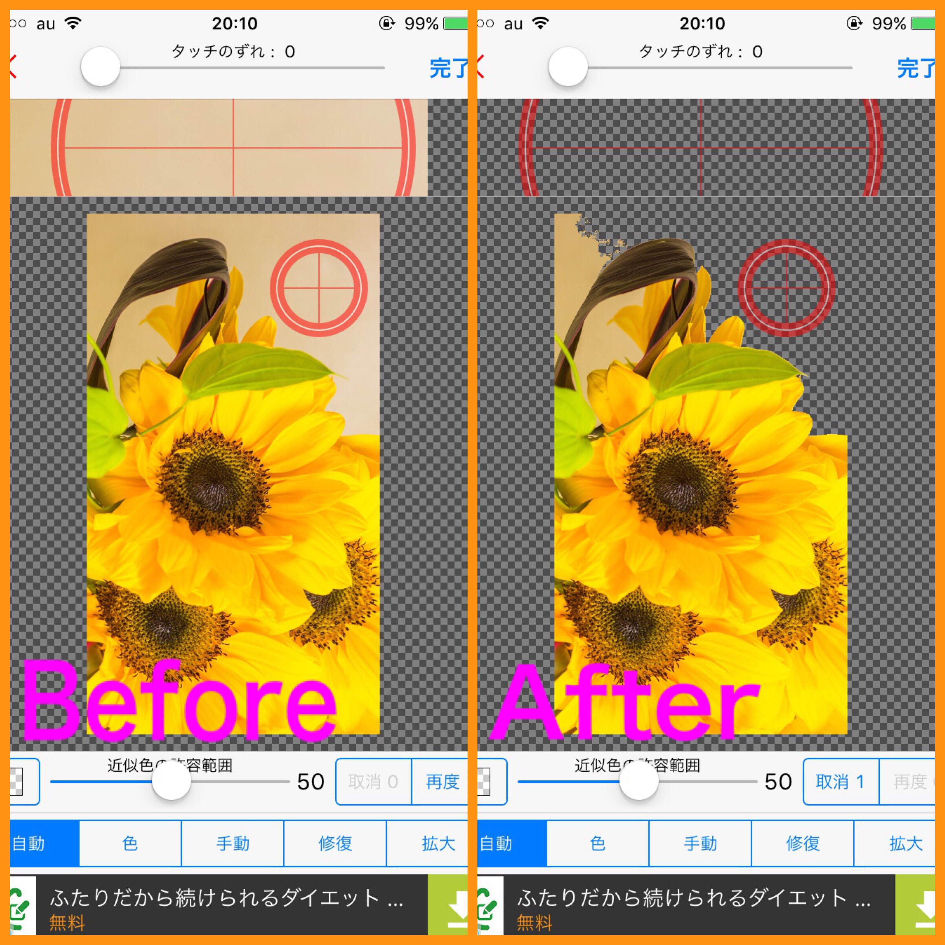 下記画像が「自動」で「許容範囲50」で背景を透明化にしたところの比較です。