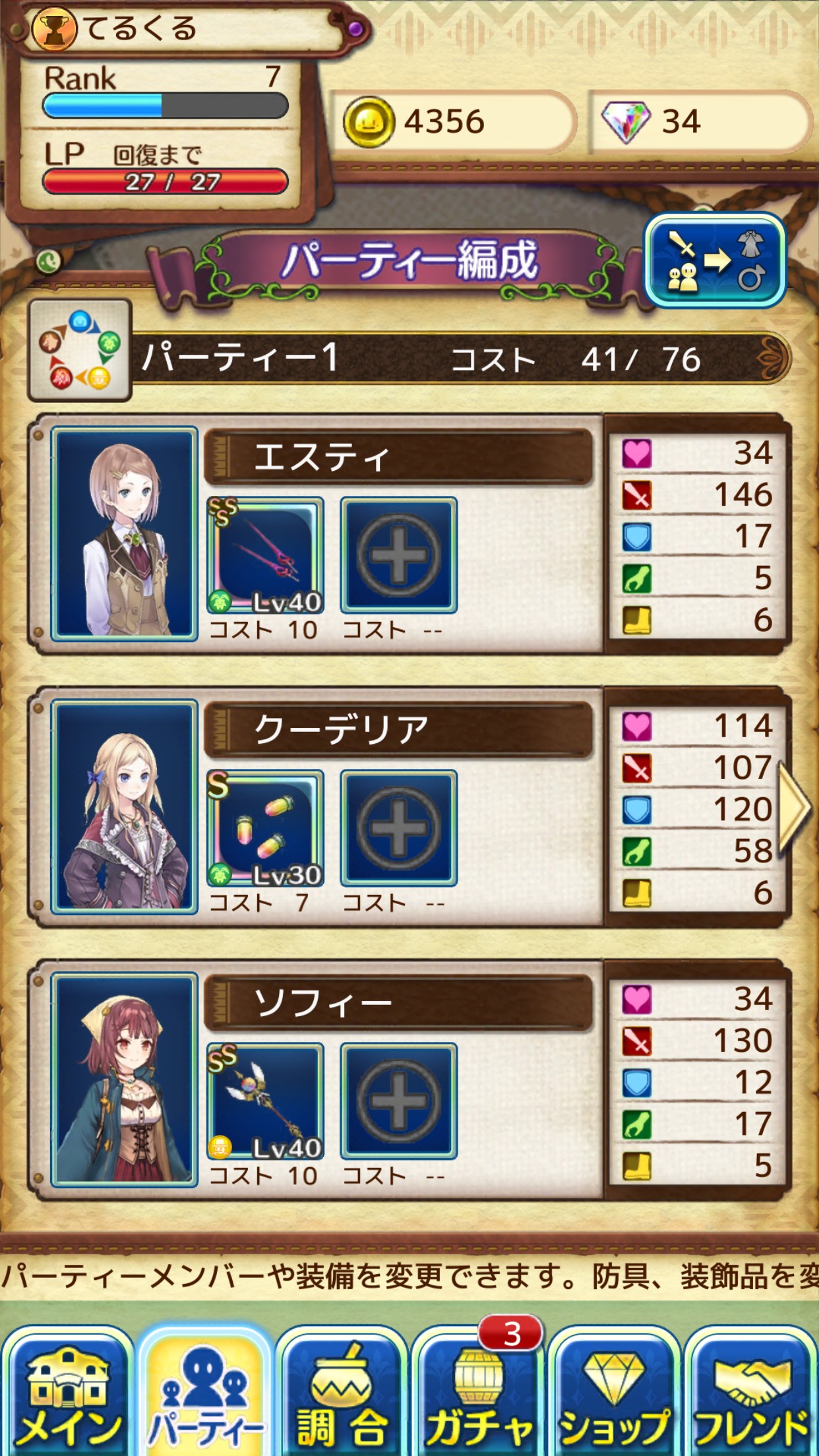 本アプリのパーティは3名のキャラクター編成になります。3パターンのパーティ編成を作成することができます。