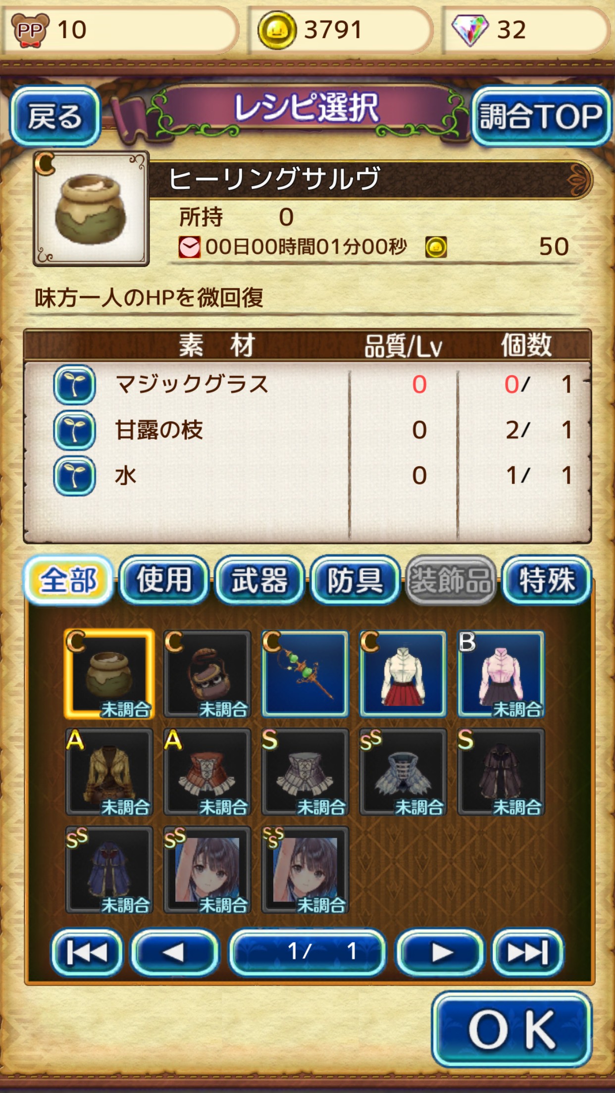 レシピ集を持っているアイテムのうち、未作成のものは「未調合」のマークがつき、必要な素材など条件がそろっていないアイテムは非選択色でアイコンが表示されます。