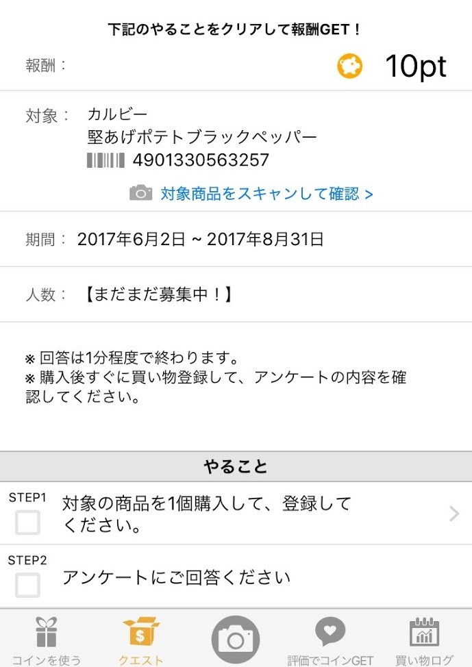 「CODE」には、特定の商品のお題に参加する「クエスト」コーナーもあります。これは、各商品の企業が募集しているもので、大抵はその商品を購入してアンケートに答えるという簡単な内容のものになります。