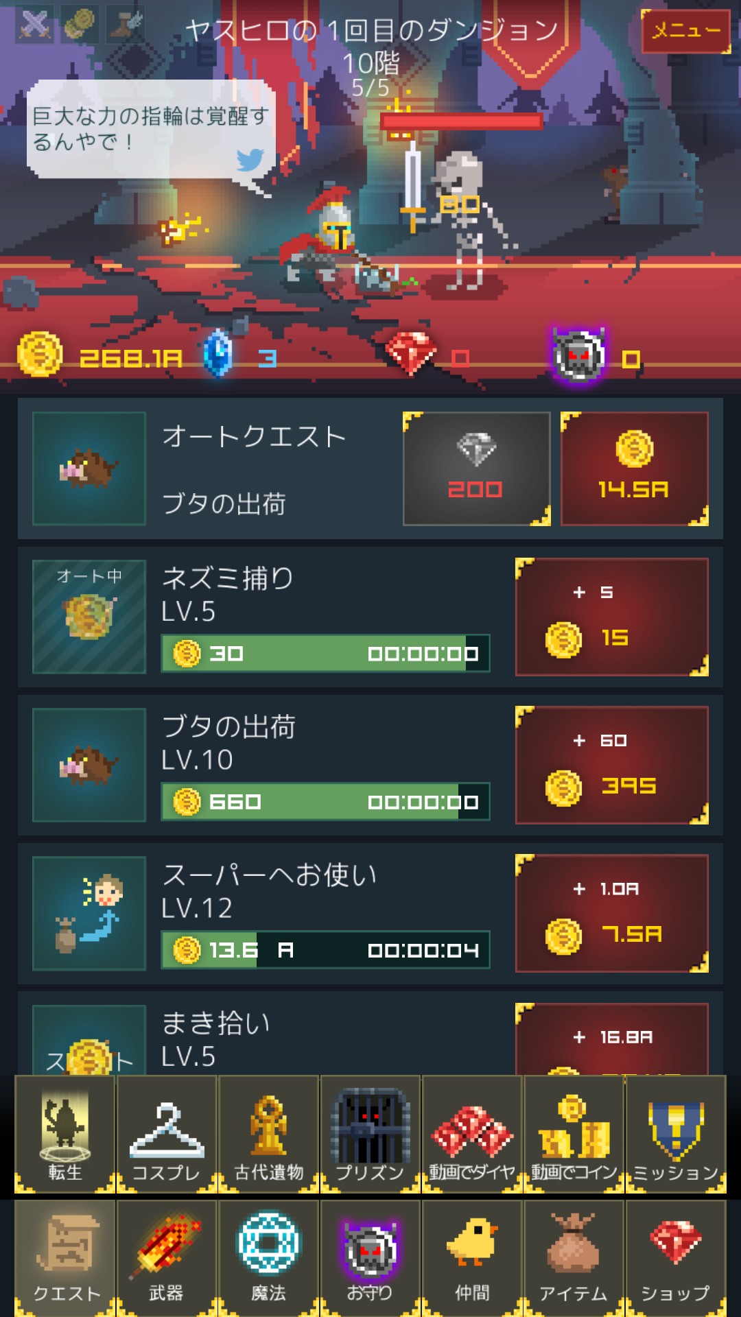 クエストはおじさんがダンジョンで戦っているのとは関係なく、タイムゲージが満タンになればクリアになりますので、クエストを受けてスタートをタップし、どんどんクリアしてコインを集めましょう。