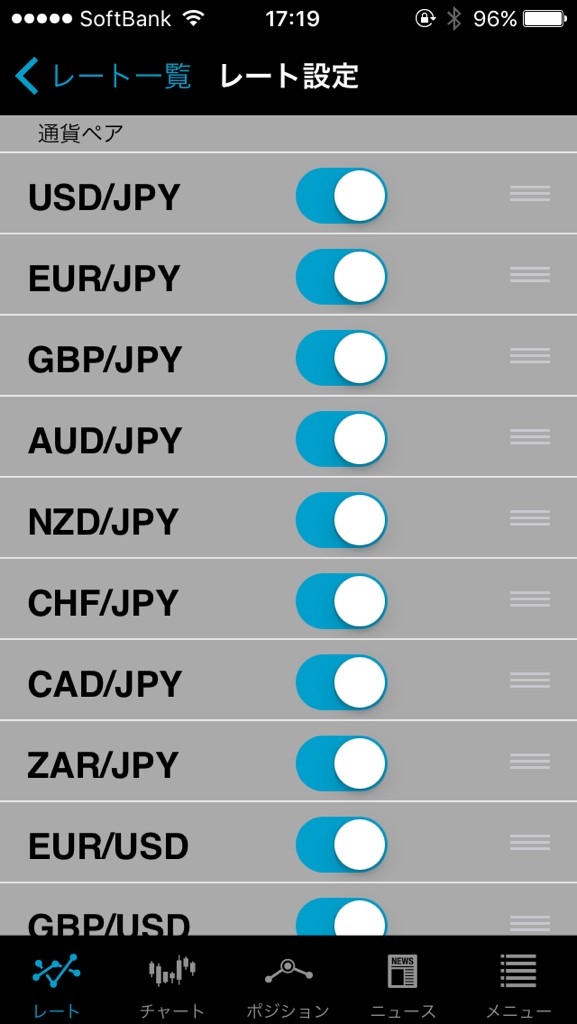 取引をする前にレート一覧スワップ一覧共にずらずらっと様々な通貨ペアが表示されているので、アプリ上部の設定画面からペアを厳選しましょう。