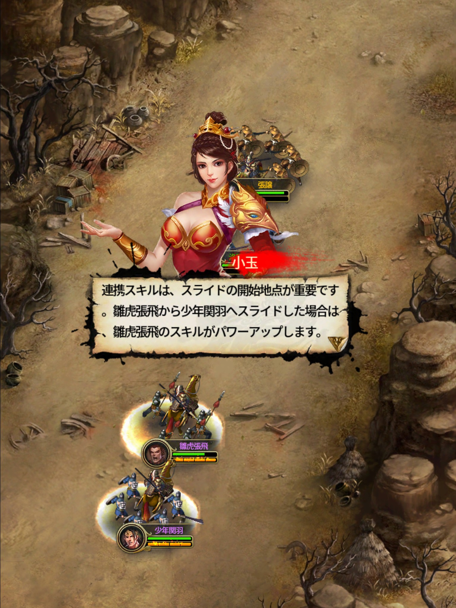この時、スライドし始めた武将がスキルを使い、スライドされた武将はスキルの強化に回ります。