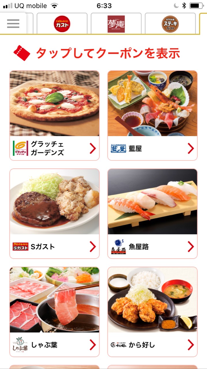 ガスト・夢庵など、ファミリーレストランを中心に展開するすかいらーく。ブランドが多い分、クーポンの種類も豊富に揃っています。すかいらーくのアプリ1つを取得すれば、15の飲食店ブランド情報を手に入れることができます。
