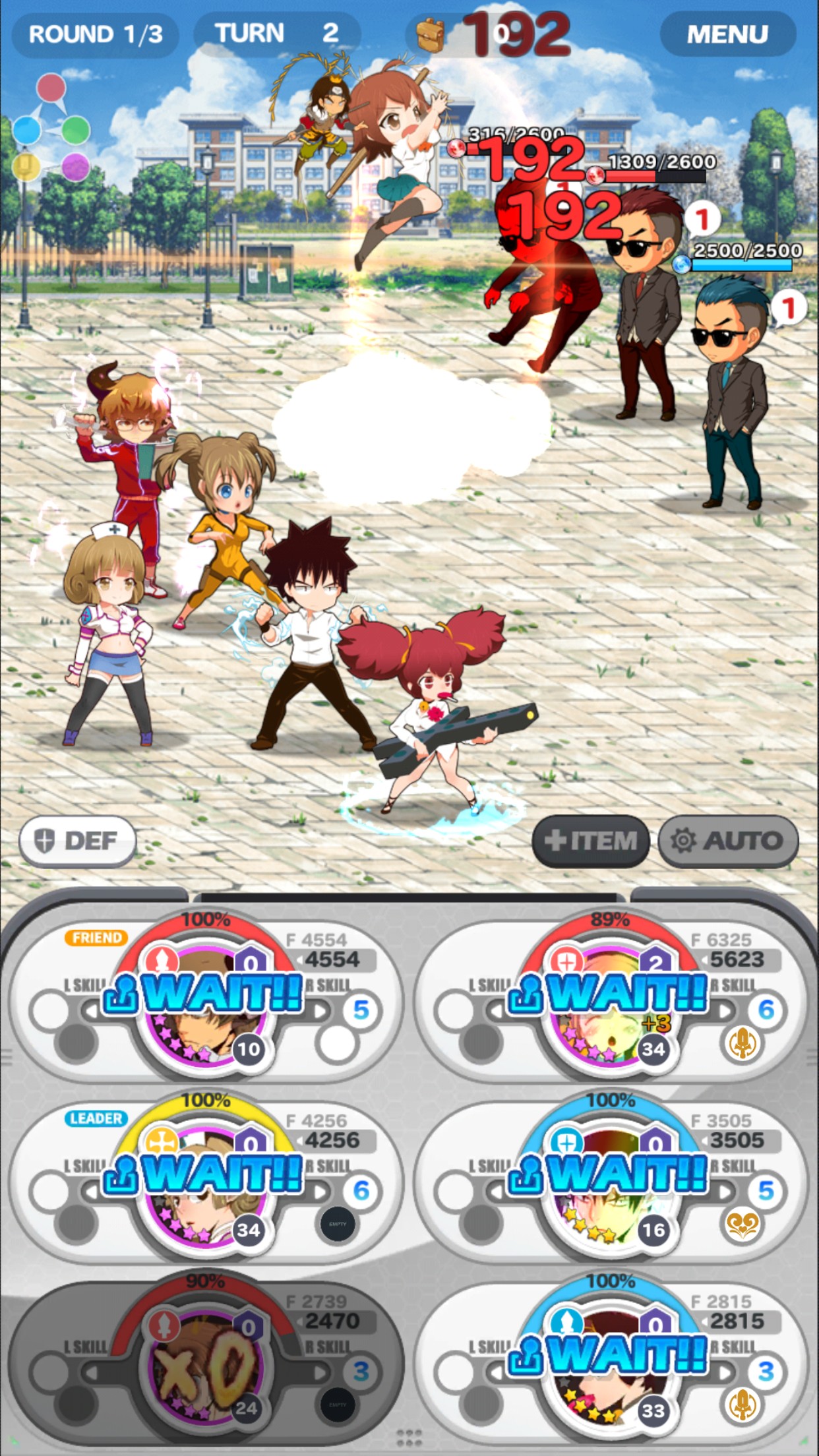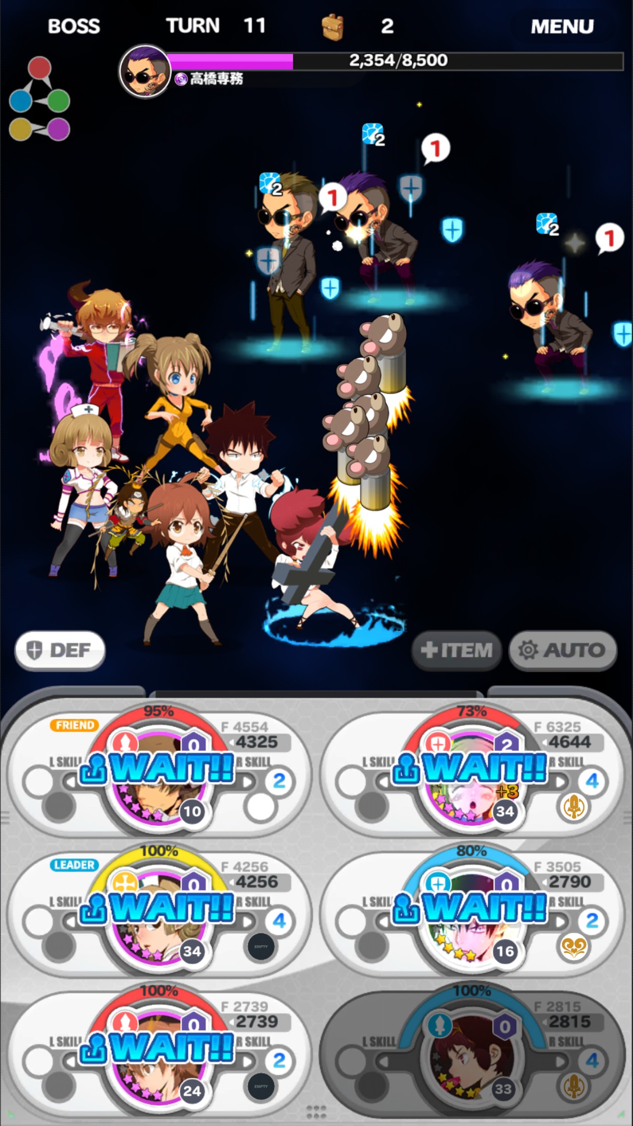 バトルは自チーム全員の攻撃、敵チーム全員の攻撃を交互に行うターン制になっています。