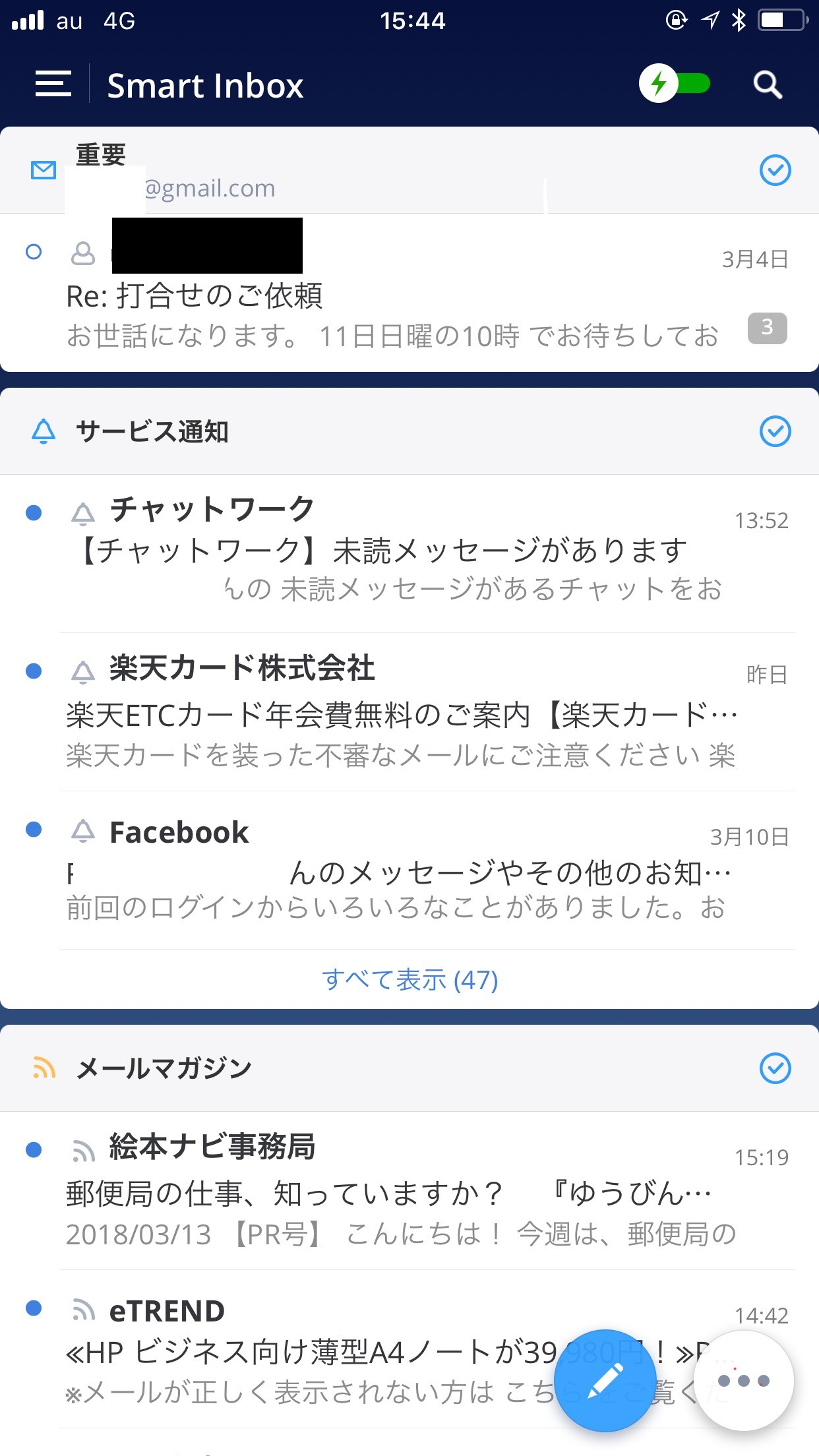 Sparkには、アカウント別に受信箱を表示する以外に、届いたメールの重要度を自動で判断して振り分けてくれるsmartInbox機能があります。受信ボックス内にさらに小さなボックスがあり、重要だと判断されたメール、メルマガ、既読のメールなど、それぞれ異なるボックスにひとまとめにして表示してくれるものです。